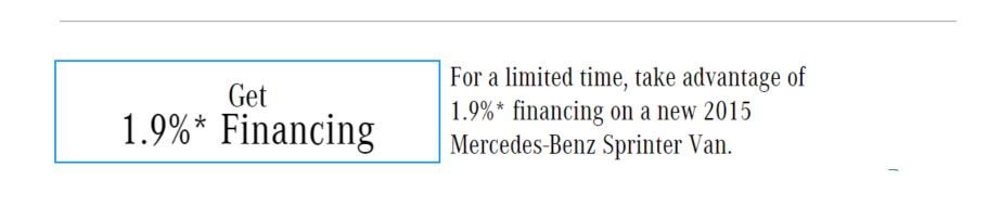 * Only valid on 2015 Mercedes-Benz Sprinter Vans. Qualified commercial customers only. 1.9% APR financing for 24 months at $42.46 per month, per $1,000 financed and 1.9% APR financing for 36 months at $28.31 per month, per $1,000 financed. Excludes leases and balloon contracts and National Fleet customers. Available only at participating authorized Mercedes-Benz Vans dealers through Mercedes-Benz Financial Services (MBFS). Must take delivery of vehicle by September 30, 2016. Specific vehicles are subject to availability and may have to be ordered. Subject to credit approval by MBFS. Actual rates, terms, down payment, and program eligibility will be determined by MBFS Credit Team based upon creditworthiness of customer. Program rates or terms may be changed or the program may be terminated at any time at the sole discretion of MBFS. Rate applies only to Mercedes-Benz Commercial van vehicles. To qualify, the total amount financed cannot exceed 110% of MSRP. See your authorized Mercedes-Benz Vans dealer for complete details on this and other finance offers.