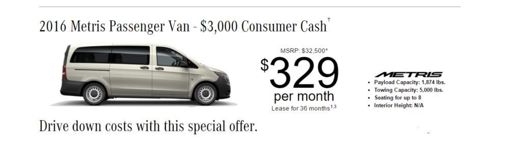 ✝︎Offer valid only to qualified customers for purchase or lease of eligible 2016 Mercedes-Benz Metris Vans. Cash back only available on the purchase or lease of a MY16 Metris Van from new dealer stock. See your authorized Mercedes-Benz Vans dealer or MBVANS.com website for full offer details. September 30, 2016.